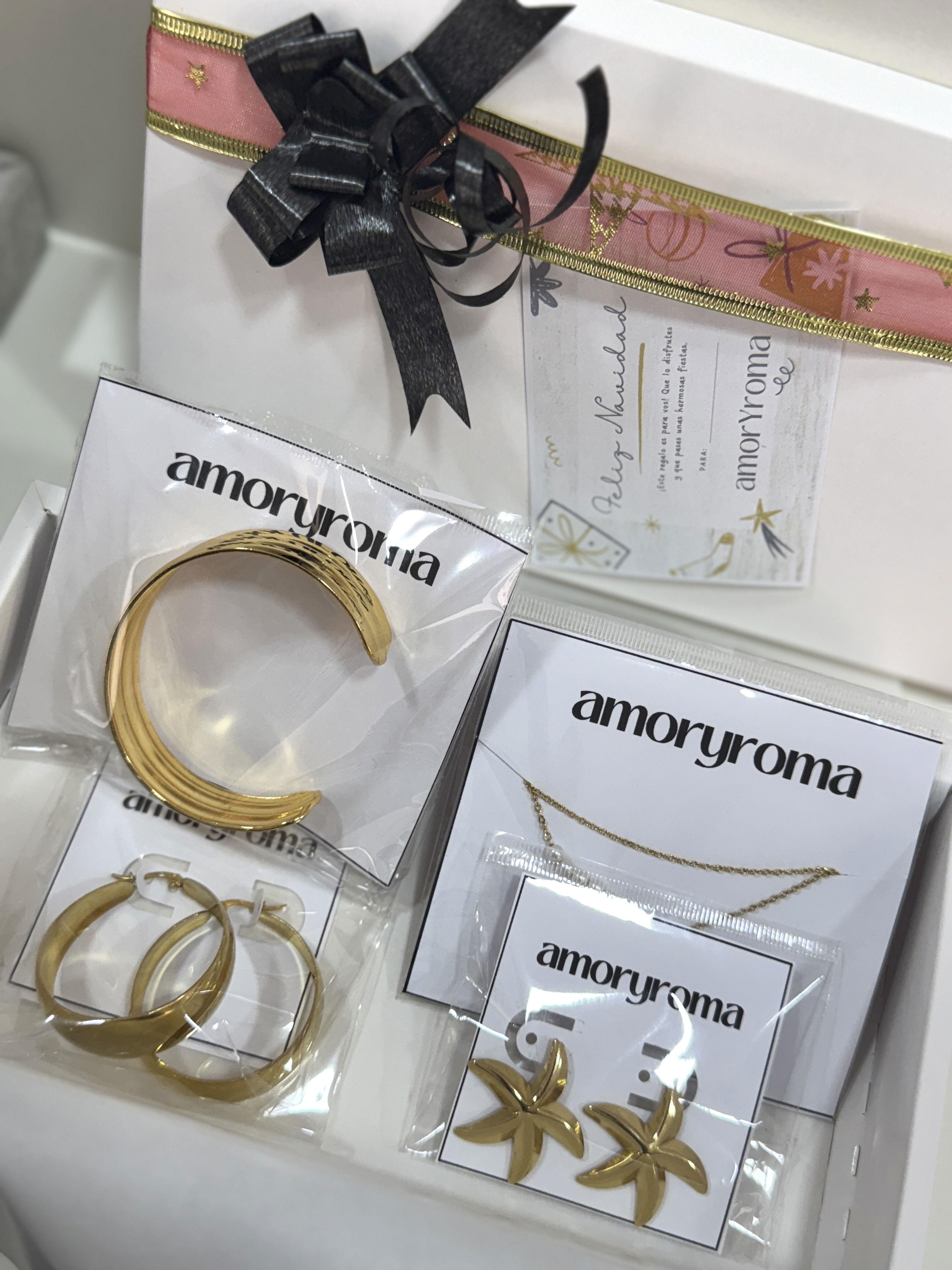 Un regalo listo para enamorar. Incluye una pulsera brazalete ajustable, un corbatero con perlas, unos aros pasantes estrella de mar y unas argollas XL, todo en acero quirúrgico dorado.