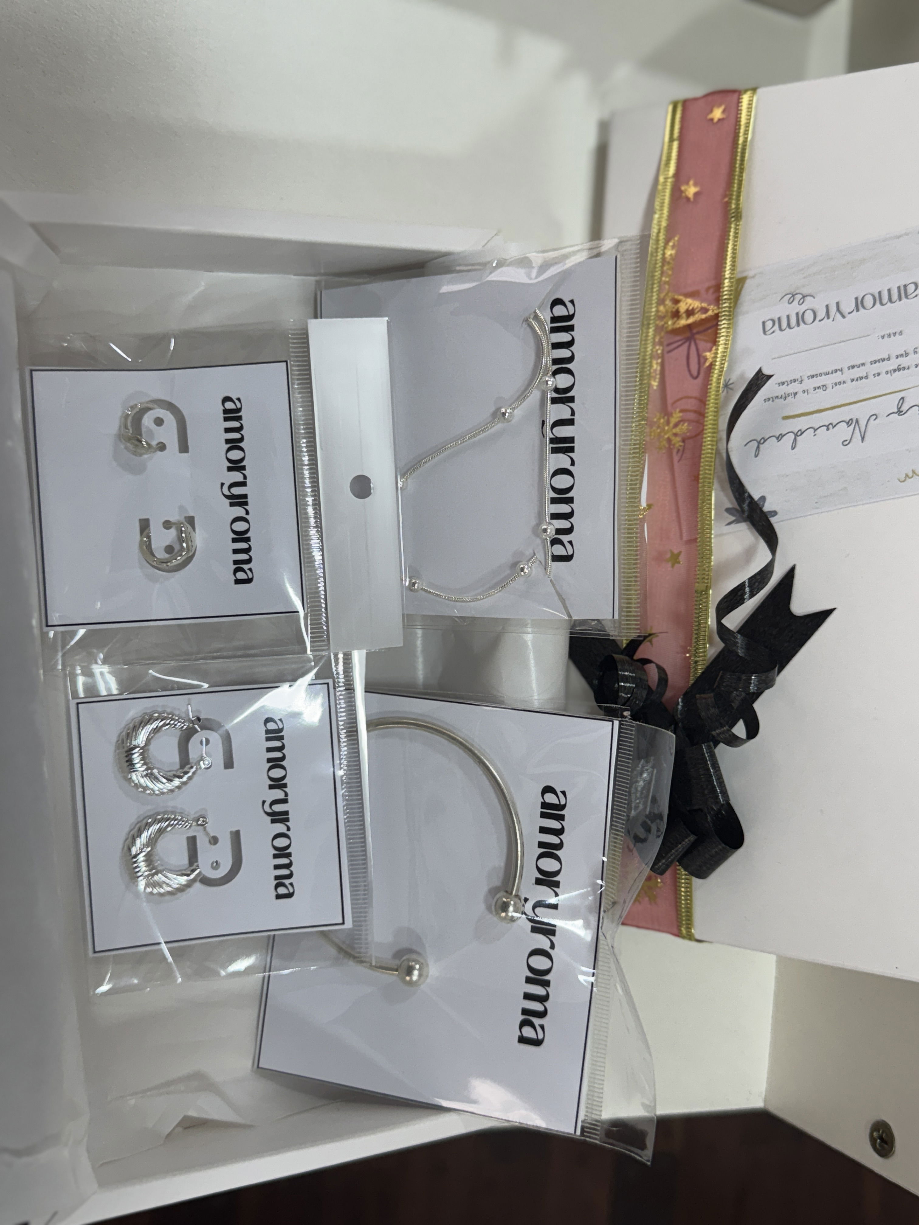 Un regalo listo para enamorar. Incluye una pulsera brazalete ajustable, un collar con bolitas , unos aros corazones y unos aros argollas infladas , todo en acero quirúrgico blanco.