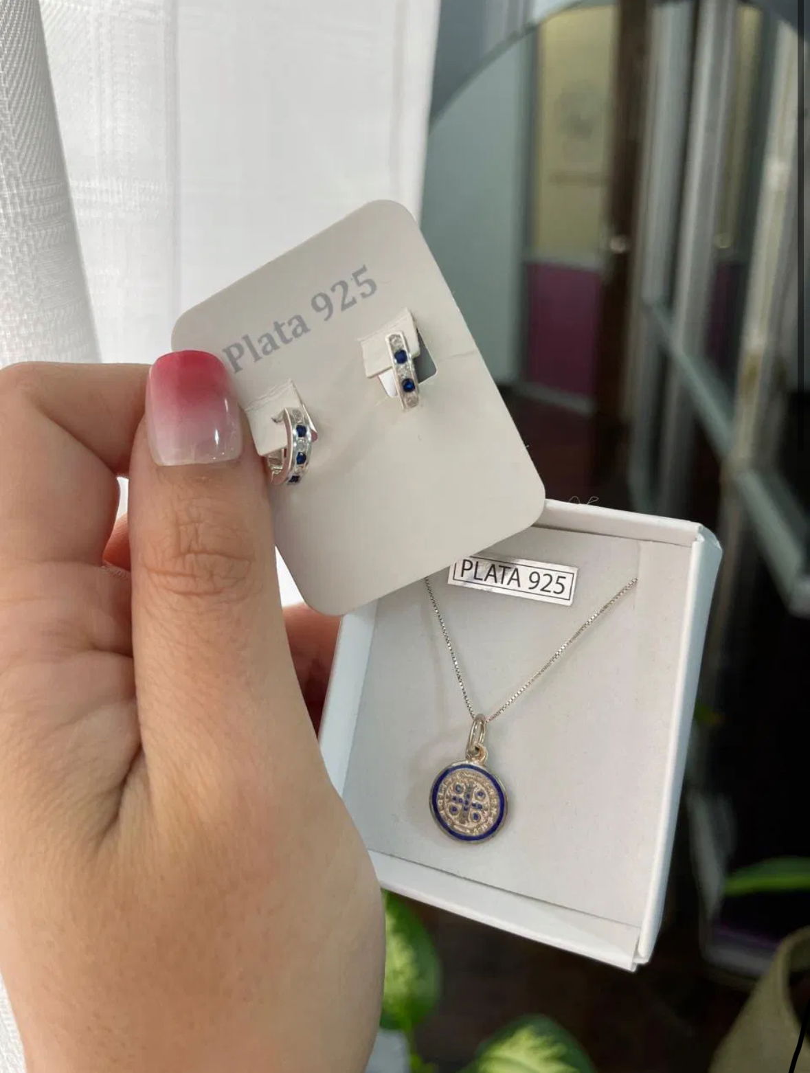 Un regalo listo para enamorar. Incluye una cadena con dije san Benito y unos aros cristales. Ambos accesorios en plata 925